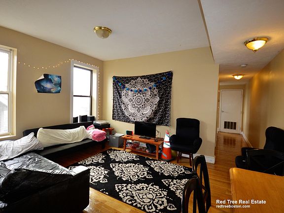 Professionally-managed four bed / two bath apartment in the heart of Allston. Beautiful hardwood flooring throughout. Huge windows let in lots of natural sunlight. Fully-applianced kitchen, equipped with dishwasher, disposal, full-sized refrigerator, and range/oven. Good-sized bedrooms with huge windows. Modern ceramic tiled bath. Laundry and parking on site. Students welcome. Cat ok.