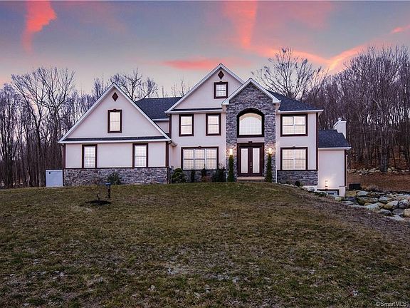 WHY BUILD WHEN ITS DONE FOR YOU? This 4yr young Burlington Colonial is proudly perched on a cul-de-sac and surrounded by 7.67 acres of natures beauty offering cascading shade, stunning foliage for a year round color display, mature lush plantings for privacy and a yard that awaits your oasis design to come to life 1st floor with custom chef's granite kitchen, beautiful living room with soaring ceilings, French doors, Paladian windows flanking its impressive stone fire place, two story foyer also with palladian windows, first floor office or sitting room and formal dining room. Upstairs, 4 generous bedrooms of which the Master suite retreat offers its own private bathroom and double walk-in closets fit for a king, 3 full bathrooms all with bathrooms, laundry room and interior balcony overlooking the homes foyer & entrance. Beautiful finished walkout lower level matches the design and construction of the home with over 900 extra square feet of living space is plumbed for another full bathroom, wet bar, Fireplace ready for installation and features a side French door access to your covered paito fantastic for entertaining This space is ideal to not only meet your needs but exceed your expections making this your forever home Welcome home to Burlington, CT where serene living easily melds with all the comforts nearby.