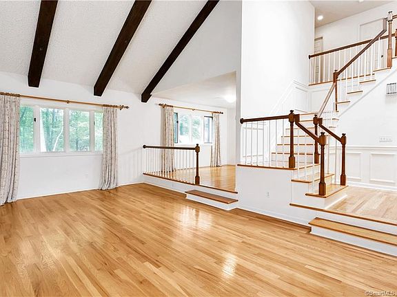 Private yet close to town. Drive up the driveway past the neighboring pond and up to this home which sits on a rear lot on a cul-de-sac just 7-10 minutes from downtown Ridgefield. A two-story entry foyer welcomes you in with the sunken Great Room with vaulted ceiling and exposed beams to your left and the formal living room with stone fireplace to the right and access to the deck overlooking the side yard. Beyond this is the kitchen with breakfast nook and adjacent dining room. The entry from the attached 2-car garage serves as both the mud room and the laundry room with a half bath nearby. Head upstairs to the Primary Bedroom Suite with full bath with shower stall, enormous walk-in dressing room with numerous closets and then step down to the Sitting Room. Down the hall are 3 additional good sized bedroom with closets and the hall bath. The lower level features a Rec/Playroom, a Multi-purpose Room and a sauna.