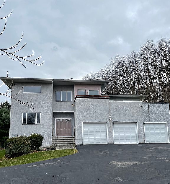 two story contemporary style with gas fireplace, lots of windows in a 2 acre wooded area, near the top of the hill, septic tank system,