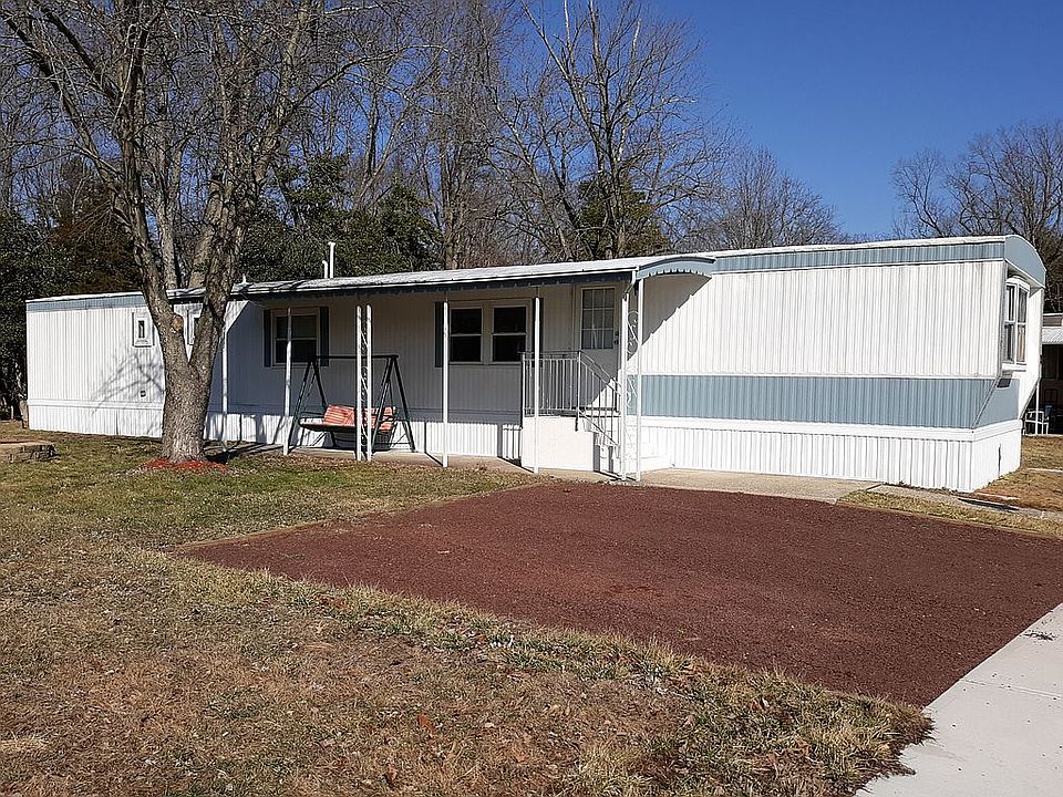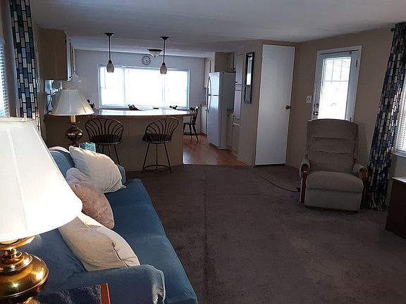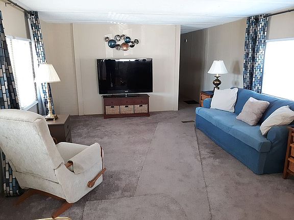 Bright, spacious manufactured/mobile home on a cul-de-sac. Situated on a large lot backed up to woods. Plenty of windows provide natural light throughout. Large eat in kitchen with lots of cabinets and a breakfast counter. Master bedroom has built in storage and full wall closet. 2nd bedroom also has built in storage. The bathroom has a large vanity and easy access shower. The laundry area houses a washer and dryer. Outside is a covered concrete patio, storage shed and fire pit. There is an outdoor spigot and electrical outlet. Lot has off street parking for 2 vehicles. Home is being sold "as is". All applicants must be approved by park management.