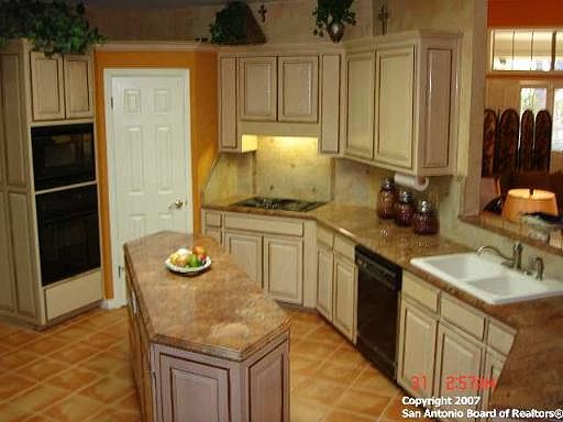 BEAUTIFUL TRADITIONAL ONE-STORY BRICK HOME IN GUARDED INWOOD**. OPEN FLOOR PLAN WITH HIGH CEILINGS. **ISLAND KITCHEN WITH **TOP OF THE LINE (GRADE 3) BORDEAUX GRANITE COUNTERS AND SERV'G COUNTER IN BREAKFAST AREA.**TEXTURED FAUX PAINTING WITH VENETIAN PLASTER WALLS.** **PLANTATION SHUTTERS.** SPLIT BEDROOMS. DUAL F/P BETWEEN THE LIVING ROOM ** IS MARBLE **AND FAMILY ROOM **IS FULL BRICK**. **WALK-IN STORAGE IN THE GARAGE.**COVERED PATIO WITH AN EXTRA PAVER PATIO SURROUNDED BY MATURE TREES.