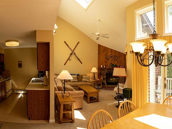 If you've been waiting for a top-floor end unit capturing maximum natural light, this is a wonderful opportunity. Located at the south end of the building, this well-designed home enjoys direct sunlight streaming into the open concept kitchen, dining and living rooms areas thanks to its large windows, skylight and cathedral ceiling. In the winter, enjoy the ambiance and warmth of the wood burning fireplace. There is a spacious primary suite on the top floor, a bedroom and bunk room on the main floor and a full bathroom on both floors. The recently rebuilt deck and ground level ski locker are other bonuses.