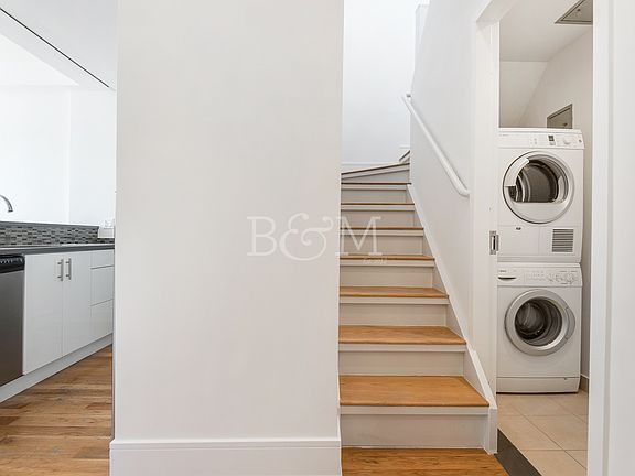 This 2-bedroom, 2-bathroom duplex sits on the corner of the top floor; A 3-floor walkup. The unit boasts an in-unit stacked Bosch washer/dryer and an oversized private roof deck. Details include two modern bathrooms (one with a tub, the other a shower), recessed lighting, ample storage, and stainless appliances with microwave in the kitchen. As a nice bonus a storage room in the basement comes with this penthouse. While the home can work for roommates it best suit a couple or individual looking for a home with a guest room or at-home workspace as the upper level does not have a door between the room and stairwell. The location is very convenient, just a few blocks from the Graham L train. Just a few blocks from the building is a wide array of restaurants, shops, nightlife venues, and grocery shop options!