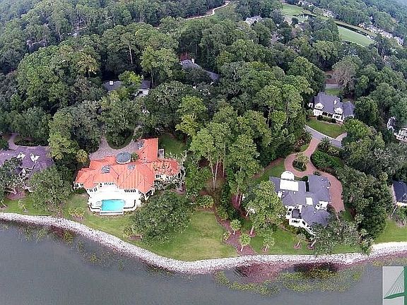 Mediterranean Style home with sweeping west views of the Moon River. Custom thick travertine tile and exotic hardwood floors throughout. Custom hand-made cabinetry for entire home, including built-ins (with 3 desks) in 5 rooms. Den/men's office done entirely in Spanish Cedar (and built-ins). Spa tub in master with his/hers vanities and double shower, with separate toilet space. His and hers custom closets, floor to ceiling shelves and etc. 16 foot ceilings in formal living room and formal dining. Den features custom coffered 12 foot ceiling, as well as 12 foot ceiling in the foyer. Screened-in porch featuring one of three gas fireplaces for the home as well as a built-in grill, fridg and outdoor sink. There is a 'hers' office with built-ins and a closet - could be an additional bedroom. Laundry room has plenty of cabinet space as well as a cast iron sink and permanent ironing board. 4 car garage with golf cart (4th) garage coming in the back. Black-out window treatments are permanent. Imported granite counters throughout the home. Work out/gym room and bonus room with extensive storage/closet space, including a cedar closet. Encapsulated crawlspace and spray foam insulation. 4 a/c units. pool and jacuzzi sit in the back of the home with extensive natural stone patio space. Bar area with icemaker, frig and cooled wine storage (large side by side units). Kitchen with 2 islands and two sinks - pot filler faucet by stove. 6 burner Wolf cook top as well as Wolf built-in microwave and convection oven, and built in refrigerator. Windows and doors are rated hurricane proof to a category 2. They are all Marvin brand. Garage floor is coated for easy cleaning. Manual or programmable yard watering system. Clay tile roof. Hard coat stucco. Built-in inside and outside audio visual and home management system by Play and Gourmet. Custom made Spanish Cedar front doors.