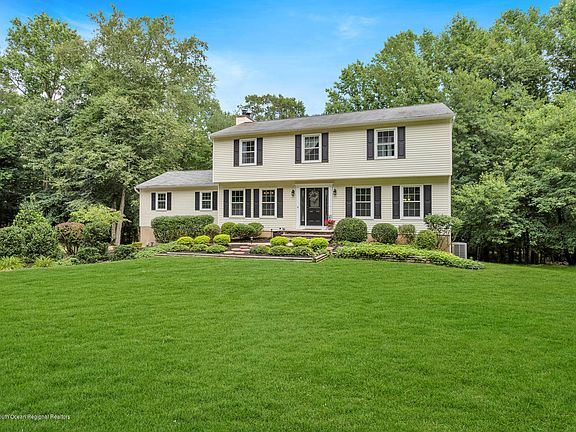 This beautifully renovated 4 BR center hall colonial offers many sought after designer touches and craftsmanship. Newly remodeled kitchen w/ upgraded soft close cabinetry, quartz counters & SS appliances incl gas stove. Newer wide plank floor, leaded glass door, updated lighting & ceiling fans & extensive custom wood molding throughout! Office/den enclosed w/ French doors. Stunning greatroom w/ a vaulted beamed ceiling, recessed lighting & wood-burning FP w/ sliders leading to a multi-tierd deck overlooking a wooded setting. All updated baths w/ crown molding. Master BR w/ custom walk-in closet w/built ins. Walk-out basement, w/ private entrance can offer added living space, home office, or additional storage. Newer septic & A/C. Minutes to NYC trans & NJ Tpk Rt 9 & mall! A must see home!