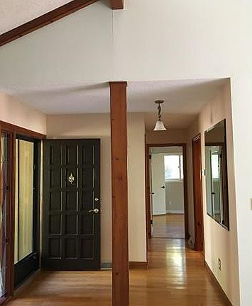 Modern but rustic home, private wooded setting on quiet cul-de sac. Custom kitchen, seldom seen at this price with huge window facing wooded, fenced yard. Gorgeous rock fireplace in the living room. Soaring cathedral ceiling with beams provide a rustic, yet refined feel. DR open to deck. Superb closet in main BR. Price reflects bit of updating mostly in secondary BR's & bath. Tall crawlspace for storage. If you are looking for a mountain lifestyle without going up a mountain, you've found it!