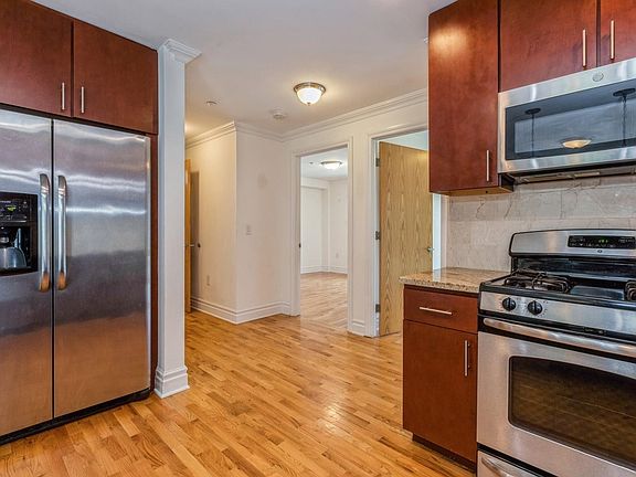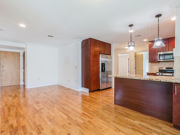 Welcome to The Gate! This is a 1069 sft 2 bed/1 bath. The unit is north, east and west-facing in a modern, 5 story, brick, elevator building just 2 blocks from the Rutherford train station and close to buses. Each unit offers hardwood floors, crown and base moldings, granite countertops, stainless steel appliances, washer/dryer in unit, keyless, entry, private balcony, central A/C and video intercom. Pet friendly up to 40lbs with a one-time, non-refundable $350 pet fee. Gated parking available - $100/month for an uncovered spot, $150/month for covered, non-garage parking. Photos are of the same apartment on a different floor..
