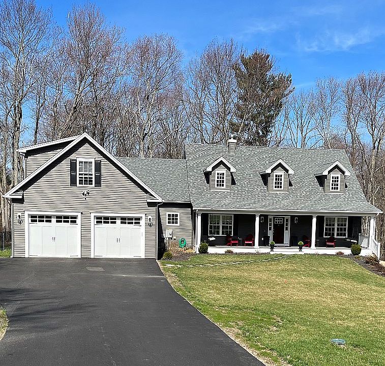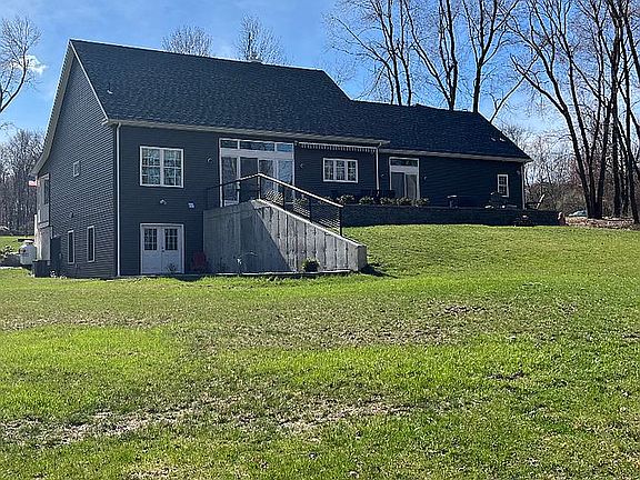 Open floor plan with 23 foot vaulted ceiling. Gas fireplace from floor to ceiling in the center of the home. Kitchen has white double stacked cabinetry with a large island with waterfall countertop. Primary bedroom is located at the end of the hallway with vaulted ceiling, 2 walk in closets and a large primary bathroom with freestanding tub and glass enclosed shower, double sinks, vanity, water closet and linen closet. The other 2 bedrooms are located on the opposite side of the house. House also has 2 attics. One walk up attic and a pull down staircase in hallway. Larger front porch with white columns with ceiling fans and 2 wrought iron porch swings. Stone patio with fire pit and motorized retractable patio awning. Walk out basement with small patio. Unfinished 600 square foot room above the garage.