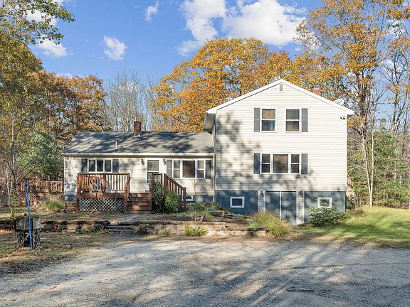 Wonderfully accessible with two entrances: the side door entrance leads to a kitchen with brand new stainless steel appliances, tile flooring and Corian countertops. Or enter through the front door to a large front room ready to be made into a gorgeous and functional mudroom-bring your vision! The first-floor bedroom leading out to a large deck offers convenience along with a serene view of the backyard. Don't forget the first floor bonus room currently set up as an office. Or easily turn this bonus room into a laundry room and with the first full bathroom already in place, you have one floor living if desired! The heart of this home is the large great room with its striking granite fireplace, hardwood floors, amazing natural light, and gorgeous beams- creating a cozy and inviting ambiance perfect for entertaining and parties. Make your way up the staircase to three more large bedrooms and a full bath.