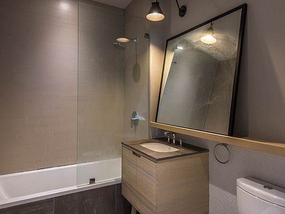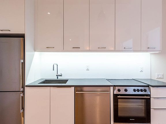High Ceilings Hardwood floors Central A/C Video Intercom Elevator Laundry in building Storage space Bike storage Gym Wheelchair Accessible Game room Lounge Skyline view Roof access Patio Outdoor Space Eat In Kitchen Stainless Steel Appliances Stone countertops Dishwasher All pets ok