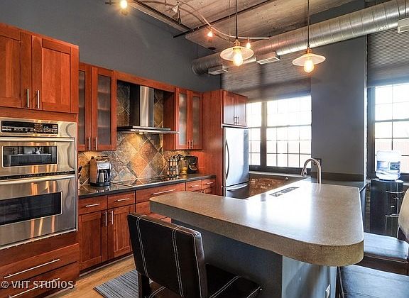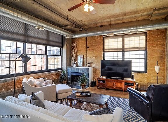 Beautiful corner unit at one of the best true loft buildings in the West Loop! Impressive 1750sq ft 2BD/2BA w/fantastic layout! Wide plank hardwood flrs, 12ft concrete ceilings, exposed brick & huge windows. High-end kitchen w/SS appls, pro-hood, double oven & Corian/concrete counters. Modern baths w/marble, slate & granite. Large foyer, fireplace, full-size laundry & 2 huge walk-ins. Heated garage parking included!