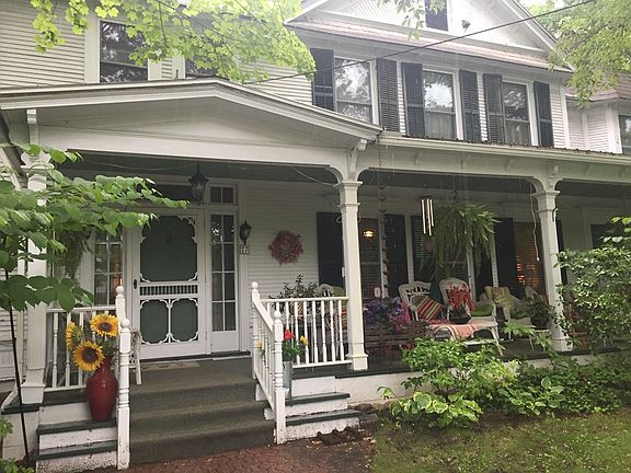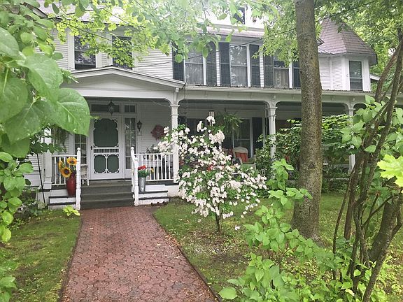 This grand home is still reflective of its era with parquet hardwood floors on main level, 4 fireplaces and 3 sleeping porches. Nestled among mature trees on 1.5 acre which once hosted a reflecting pond, shuffle board and perennial gardens galore w/pathways between several gardens. This 7 bedroom home (2 bedrooms offer 2 room suites) could easily become your vacation home, main residence or IDEAL for a B & B with its separate staircase leading to old domestic help living quarters, Read a book or enjoy coffee on the 44 foot front covered porch. Convenient location to shops and park. Some Furnishing are available for sale at additional cost.
