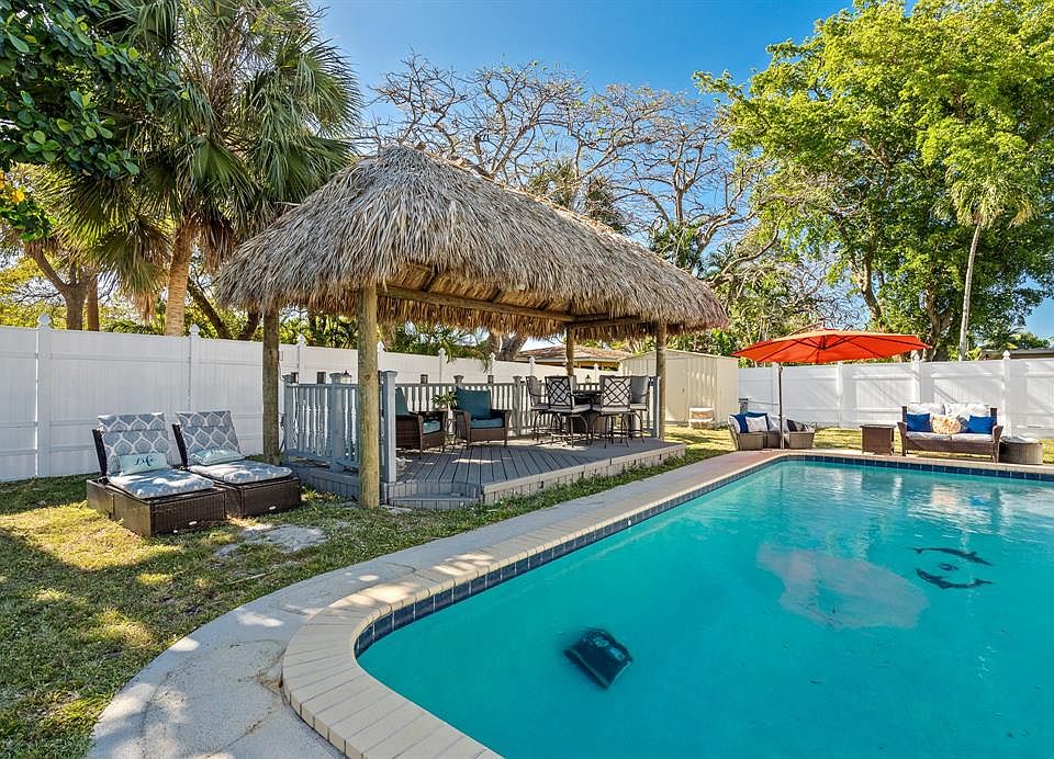 This 4 bed/2 bath pool home is conveniently located off Broward Blvd (ideal for I95 turnpike). The open concept layout flows seamlessly. Windows at the back overlook pool and deck - the perfect space for sipping cocktails on those long summer nights. Converted garage (with AC) can be used as office, TV/media room or as a 5th bedroom. Back yard overlooks a green space, so it's very private. The house has been updated with new blinds, ceramic tile floors, appliances, roof, AC, & hot water heater. Other improvements: fence replaced, gutters installed, master bath/vanity/sink, pool pump, ceiling fans in bedrooms (all 2023). Tiki hut w/power, 55-inch TV/ceiling fan, impact windows & doors, 50 amp outlet for camper van/boat, dryer converted from gas to electric (all 2024). Furniture neg.