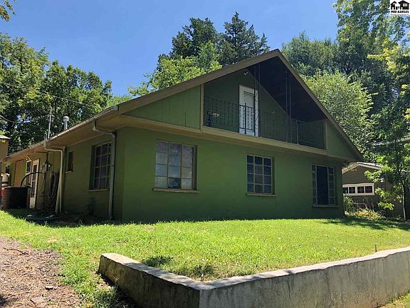 This home that comes with so many amenities is nestled into the center of Elm Mills Recreational Resort located just 20 minutes from Pratt, KS. The resort offers gated community, stocked fishing lake and pond, man made natural swimming pool, water slide, play area for kids, nature trails, picnic are for private use and used for member social events. This home was built in 1930 with the east side and upstairs added in 2004. As you enter the cabin you have a large living room with a pellet stove, nice size formal dining room and spacious kitchen that comes with some shelving, refrigerator, stove and bar stools that offer more seating at the kitchen bar. The main floor offers two bedrooms with built in dresser and closet. The bathroom has new flooring and sink. Upstairs you will find a nice size room you could use for recreational or additional family room. There is also another bedroom that comes with the king size bed and all the newer built in cabinets/closet. It also has own private covered balcony to enjoy the nice evenings outside. Another bathroom and a large walk in shower and large vanity is located on this floor. You can get upstairs by either walking around and using the backdoor or there is a elevator inside that will take you upstairs. Outside you will find a nice patio in the back that is very private. There is also 8x10 workshop and 16x20 shed to store all your outdoor equipment. Make this home your relaxing "happy place".