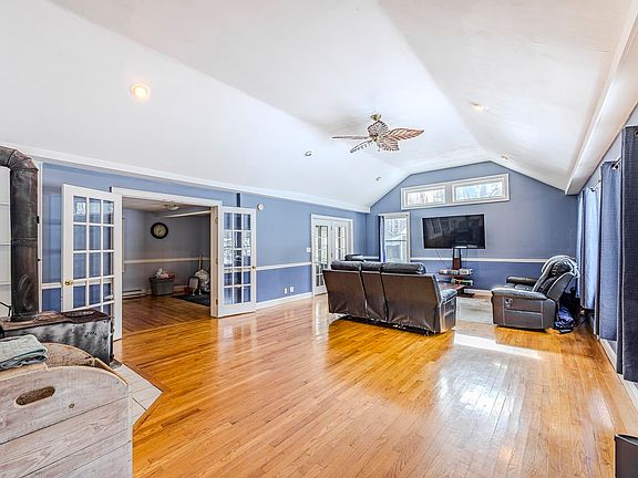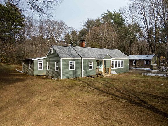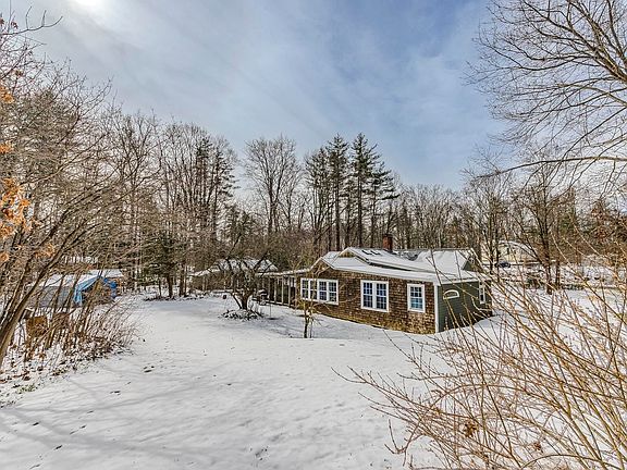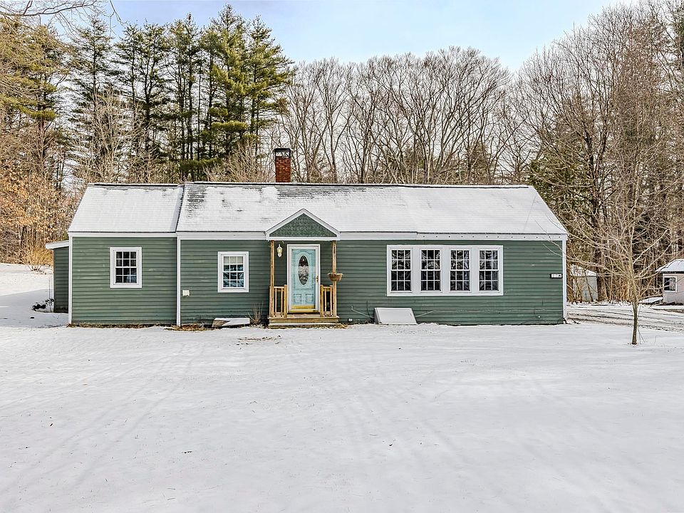Come see this private country abode that sits on 3.6 wooded acres with a large grassy yard that welcomes you as you go up the gravel drive. Enter in through the large screened in porch, which currently keeps the firewood dry and will be perfect for relaxing in the upcoming Spring weather. Cathedral Ceilings and unique beams in the kitchen with stainless steel appliances, knotty wood floors, espresso cabinetry, and an eat in area overlooking the dining room with lots of lighting. The family room has Cathedral Ceilings, French doors, built in shelves, a wood stove, and plenty of natural light. Conveniently located off the family room is a spacious laundry room with additional shelving for storage. Set apart from the entertaining space, down the hallway, are 3 bedrooms and 1 full updated bathroom. The primary bedroom features a walk-in closet. The home is in a great location as it is close to Rt. 125 for shopping, restaurants and highways! Come see this home today!
