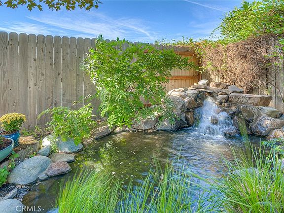 The home features a spacious 3-car garage and landscaped front and backyards, complete with a tranquil waterfall feature. Step outside to enjoy the covered backyard concrete patio, perfect for entertaining, with fenced backyard and side yards providing added privacy.