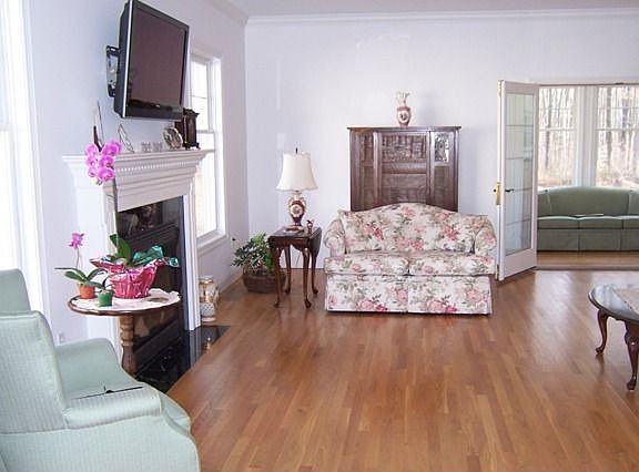 Approximately 2 year young free standing home in adult community (at least one member of household must be 55 years old) was built with custom upgrades throughout. This beautiful home boasts open floor plan with gleaming hardwood floors, a gas fireplace in the large living room, gourmet kitchen with granite, GE Profile appliances, luxurious master bedroom and bath; also a 4-season heated porch and separate den/study. One of a kind much privacy in rear yard Nothing else like it!!!