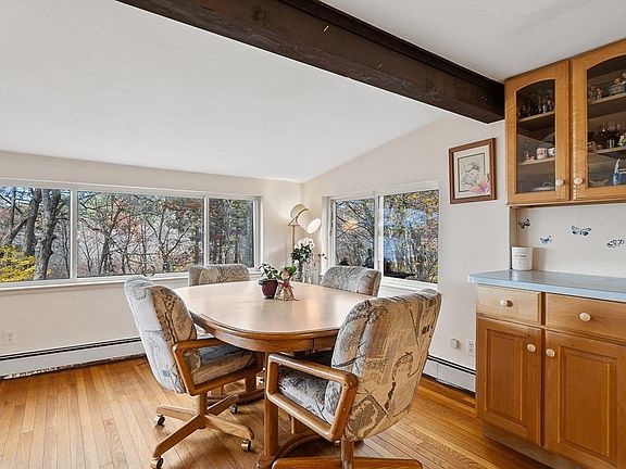 Water views with deeded right of way to Forge Pond for all your summer and winter sports. Rustic exterior lends itself to maintenance free out door living. Main level offers an open concept design. Galley style kitchen with pantry and laundry hook up. Expanding dining area and family room with seasonal water views. First floor master bedroom and full bath. Two bedrooms on the second floor. Walk out lower level has three additional finished rooms. Fenced in yard has stockade fencing for privacy.