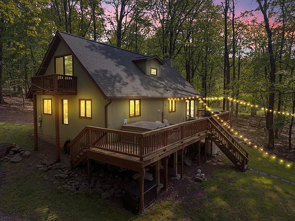 This charming 3-bedroom, 2-bath home offers the perfect blend of RUSTIC CHARACTER and comfort. Featuring VAULTED CEILINGS, WOOD ACCENTS throughout, and an eye-catching A-FRAME FRONT, the home's UPDATED BATHROOMS add a modern touch. Step out onto the SPACIOUS BACK DECK with a JACUZZI, or unwind by the BEAUTIFUL FIRE PIT AREA. In the winter, enjoy SEASONAL VIEWS OF BIG BOULDER'S ILLUMINATED SKI TRAILS. Located in sought-after LAKE HARMONY ESTATES with LAKE ACCESS and community amenities—an ideal retreat or YEAR-ROUND GETAWAY. Central Heat and AIR CONDITIONING.