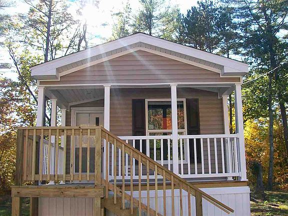 FABULOUS NEW HOME. A 2017 MODEL!! Fabulous Looking Front Porch with white vinyl posts! Really Cute look to this model home. The inside has open kitchen and livingroom with bedrooms at each end of home. Constructed with 2x6 framing and vinyl clad windows. The home is set on a slab with white vinyl framing and steps. Ready for a new owner to move right in!! The park has a sandy beach area on the lake for residents to use as well!! Live like your on vacation year round in this Brand New Home!