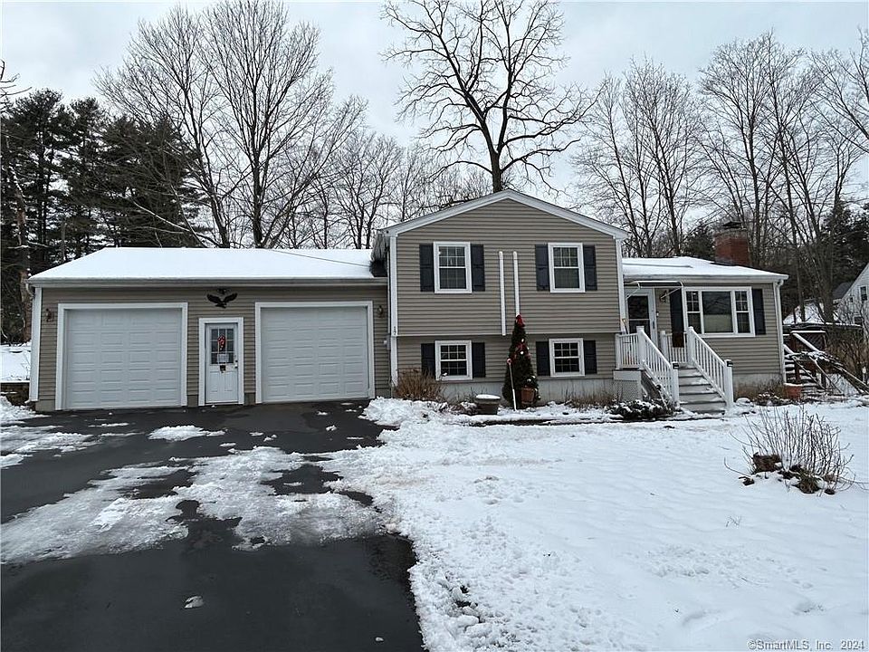Yalesville section of Wallingford. Three bedroom 1.5 bath home has hardwood floors, a remodeled kitchen with quartz countertops, open floor plan, large lower level familyroom room with laundry and 1/2 bath and a oversied two car garage. There are 4 mini spits for additional heat and air conditioning. The lot has an expansive side yard for activities. Note Seller has surveillance camera on property. .