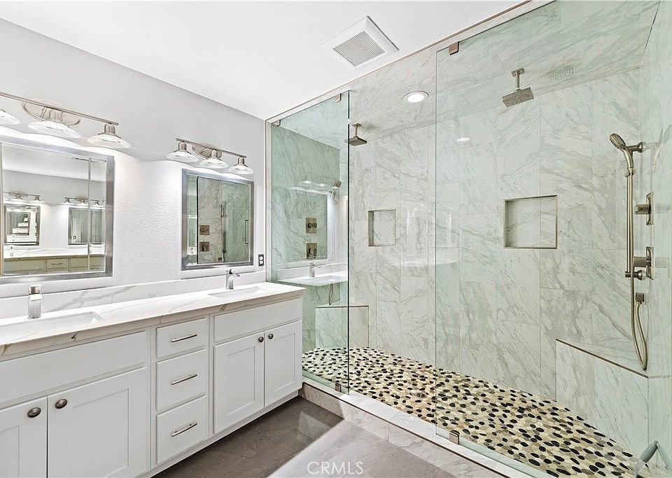**POOL HOME**home in Melinda Heights, this 4 bedroom property features 1 bedroom down, 3 bedrooms up, and is near one of the most popular parks in Rancho Santa Margarita! A quiet backyard and too many upgrades to mention as this property offers a primary bathroom not rivaled by most!! Both bathrooms upstairs have been remodeled with custom quartz counters, tile floors, frameless shower doors, lighting, and cabinets. Originally built with an optional shower downstairs (currently powder: inquire for details), the downstairs is being used as an entertainment area but is perfect as an office, in-law suite, or gym! The home also comes with a whole house fan, plantation shutters, built-in surround sound, a water softener system, a tankless water heater, and a saltwater pool! Custom pebble tech surface, variable speed pool pump, and built-in BBQ make this backyard ready for those who love to entertain! The 28 solar panels are on a lease of only $121 per month!! Wow!! TWO HUGE GUEST BEDROOMS upstairs each having their own walk-in closet! The primary bedroom could be two rooms, ITS THAT BIG! It offers not 1 but 2 walk-in closets! The location is ideal as you've got nobody behind you and walking distance to Estrella Vista Park known for its amazing views and multiple playgrounds! No Mello Roos and access to Rancho Santa Margarita's master community amenities such as the beach club, pools, tennis courts, and water park for the kids!