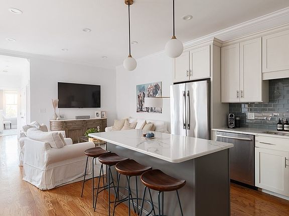 Penthouse 2 Bed 2 Bath condo with private roof deck on a charming gas-lit street. The 3 exposures keeps this home full of light. The living room is the true heart of this home as It opens to the dining area & kitchen. The cozy dining area tucked away in its own nook has wainscoting, a window & a beautiful custom built-in with a display case, shelving & drawers. The gorgeous kitchen with tall white cabinets has a grey island for seating & storage, quartz countertops, glass subway tile backsplash & sleek stainless steel appliances. The Primary suite with city views has an en suite bath with porcelain tile & well-lit mirror and vanity with storage. The spacious 2nd bedroom has ample closet space. This open floor plan with high ceilings has walnut-stained oak floors, central a/c & recessed lighting throughout & private laundry. Enjoy direct access to the large private roof deck with Trex decking, convenient storage shed, direct gas line & a jaw-dropping view of the Boston skyline.