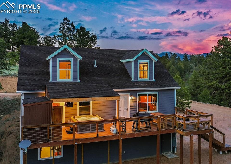 Your ultimate Colorado vacation home awaits in Cripple Creek Mountain Estates! This nearly brand-new retreat sits on a spacious corner lot of over an acre, offering some of the most breathtaking views in Teller County—sweeping rock outcroppings and panoramic vistas all the way to the Sangre de Cristo mountain range. Built with hosting in mind, the home is already set up to comfortably accommodate up to 16 guests. The oversized deck is the centerpiece of the property—outfitted with a hot tub, sauna, outdoor shower, and mounted TV—creating an unmatched outdoor living experience. Whether you’re entertaining a crowd or winding down after a day of adventure, this space delivers the ultimate mountain escape. Inside, the open main level showcases the views at every turn. A cozy fireplace anchors the living room, while the gourmet kitchen features custom cabinetry, granite countertops, a butcher block island, and plenty of space to cook, dine, and gather. The main level also includes a spacious primary suite with attached bath, a second bedroom, and a dedicated office. Upstairs, a large bonus room provides bunk-style sleeping for six, while the walk-out lower level offers a family/game room, oversized garage, and another bedroom that accommodates six more. Every space has been thoughtfully designed, beautifully maintained, and feels like new. Best of all, this home comes fully furnished—just bring your toothbrush! Whether you’re looking for a personal mountain getaway, a family retreat, or a high-end short-term rental with incredible income potential, this property checks every box. With year-round access, modern comfort, and unforgettable views, this is mountain living at its finest.