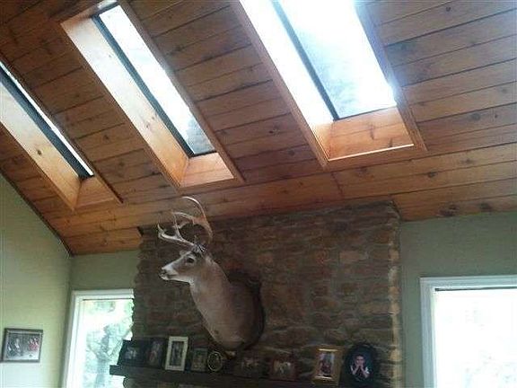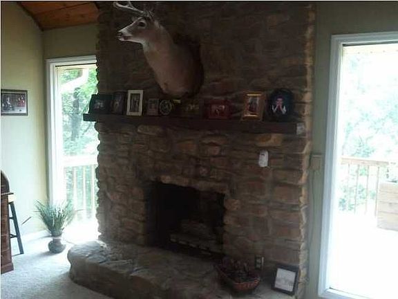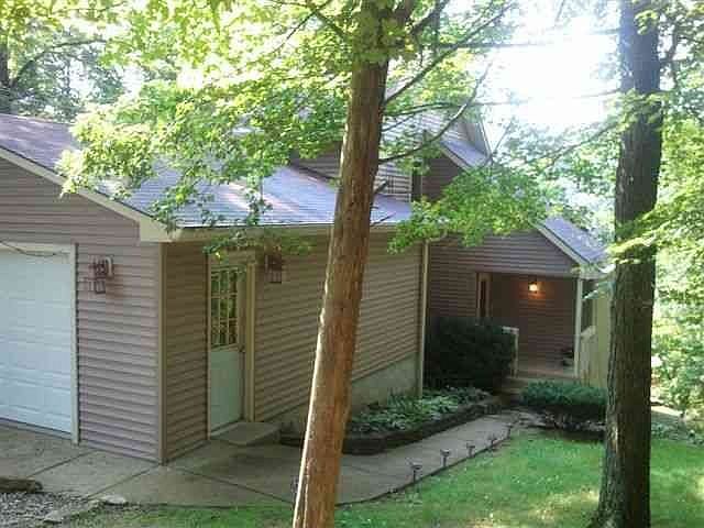 Secluded in woods and directly on lake with a magnificent overview of lake. Beautiful stone hearth fireplace on main level and another with buck stove insert on lower level. Spiral staircase, enclosed patio and all appliances to remain. Very unique and rustic. Only 15 minutes from Fort Knox in private gated Doe Valley.