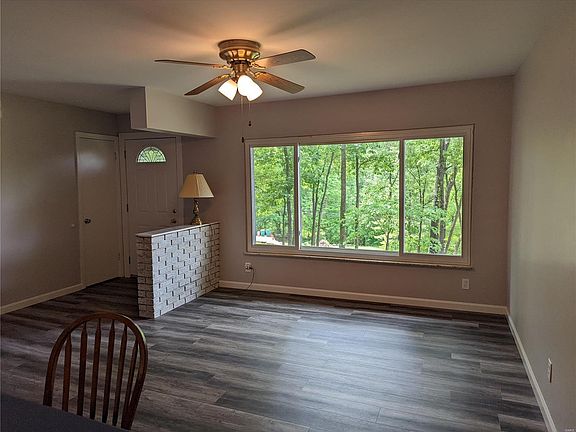 Secluded on a wooded lot, you will feel like you are on vacation every day in this 3 bedroom 2 bath home. The large living room picture window overlooks the sprawling lawn. At the same time, the backyard is surrounded by mature trees giving you the privacy you are looking for all while conveniently located near Gravois Bluffs. The main floor features two bedrooms, a full bath, and luxury vinyl plank flooring. The kitchen provides ample countertops, newer appliances, and a breakfast bar. An enormous crafting room hides the main floor laundry, features an extra refrigerator, and sink for washing up after your hobbies. Up the rustic staircase, you will find an open loft area, perfect for a reading nook, or play area. Natural light from the skylights brightens the upper level which provides the potential for two bedrooms separated by an additional full bath, including a shower with a built-in seat. The sellers would appreciate an as-is sale on this home in unincorporated Fenton.