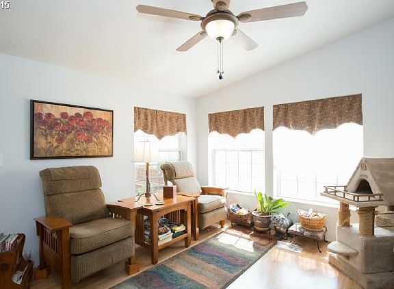 Cute 3 BR manufactured home in a quiet neighborhood! You own the lot! Vaulted ceilings, laminate floors and skylights! Family room and separate living room. Washer, dryer and refrigerator included! Large covered deck. Private backyard backs to a greenspace. Detached garage!