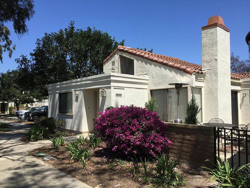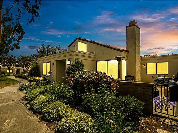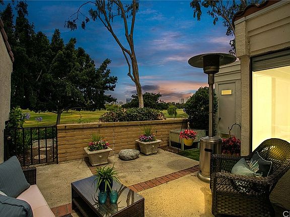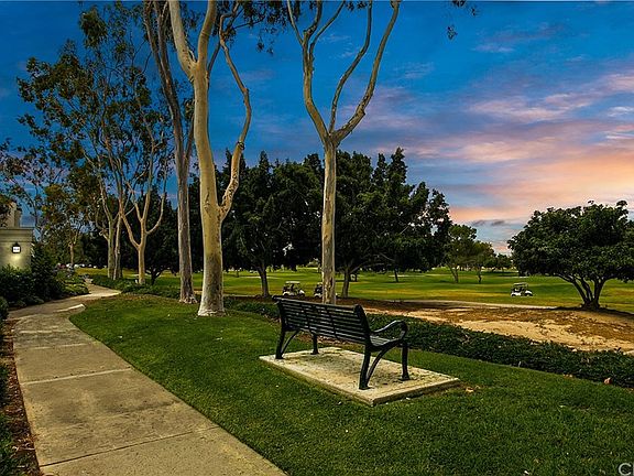 A Panoramic Golf Course-Sunset View, Single Level Home with No Steps to or inside of the house awaits you! This one story villa is located at the edge of the Golf Course where you can enjoy the beautiful view of the Golf Course far from the traveling Golf balls. Open floor plan, freshly painted throughout, nicely upgraded + 2 Car Garage. Upon entry, you will walk into a small hallway with a large double door jacket closet to the right. A few steps in and you will walk into your living room/family room with windows overlooking the golf course & a sliding door which leads to your spacious backyard. Kitchen opens to the dining room, has modern white cabinets, black granite counter tops and stainless steel appliances. A good size pantry + laundry closet with full size washer & dryer are also part of this practical yet beautiful kitchen. The window above the double sink overlooks the backyard & the golf course. With this view, you will never get bored washing the dishes or prepping the food. Dining room has vaulted ceilings with windows high above to invite natural light into the house. The Bedrooms are tucked away to the left of the house and both are spacious with brand new carpet. The master bathroom is nicely upgraded with double sinks, white cabinets and granite counter top. The 2nd bathroom is also nicely upgraded. This villa is in a very well kept community with pool & spa which is located very close to UCI, Award winning schools, Major Shopping centers and exit to freeway.