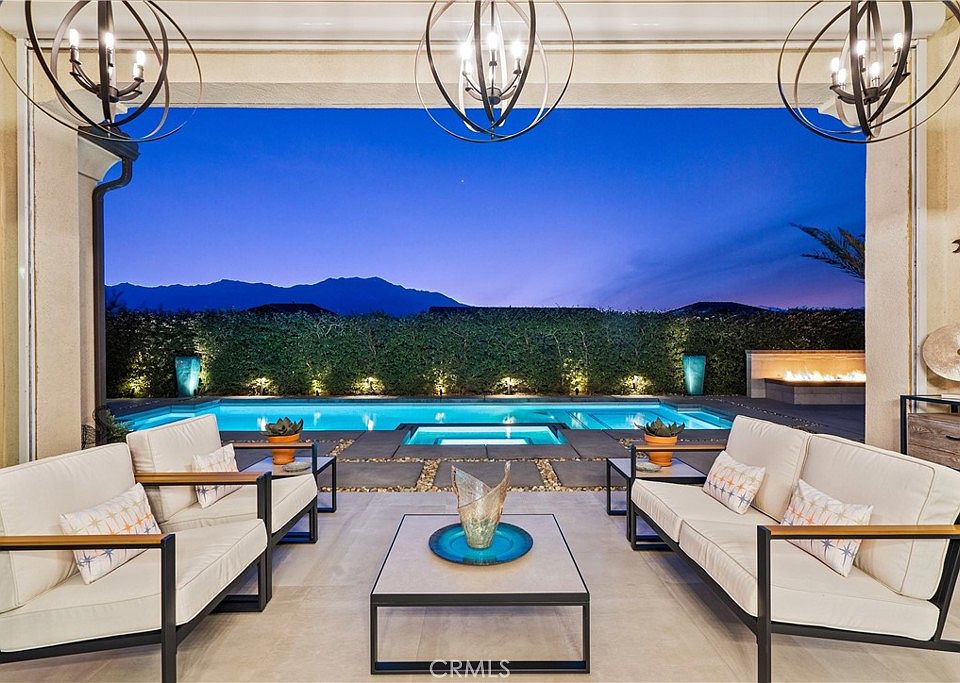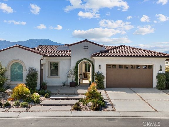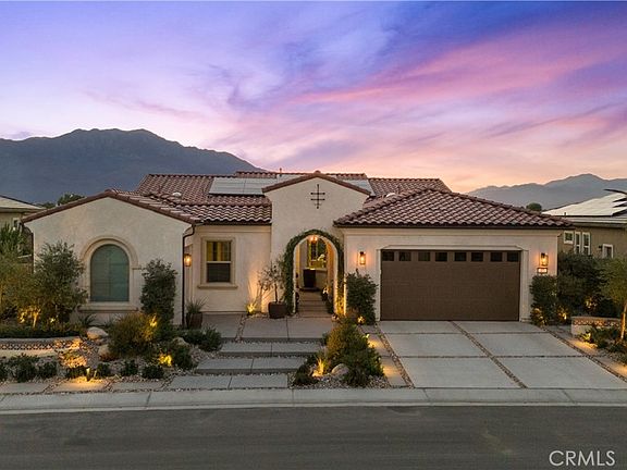 Welcome to a residence that defines opulence and sophistication in the prestigious gated community of Del Webb Rancho Mirage. This one-of-a-kind estate is a true masterpiece, meticulously crafted and upgraded to perfection. Custom furnishings, included with the property, add the final touch. Upon entering through the double arch entry, you'll step into over 2,500 square feet of living space that exudes elegance. The residence features 3 bedrooms, including an expanded owner's suite, and 2.5 bathrooms. Every detail reflects pride of ownership, from beautiful ceiling accents to modern design niches and abundant natural lighting. Designed for indoor-outdoor California living, this home offers a seamless transition between spaces. The great room features a massive folding sliding door, opening up to panoramic mountain views. The chef's modern kitchen is a culinary delight with stainless steel appliances, a built-in KitchenAid refrigerator, quartz countertops with a waterfall island breakfast bar, and a walk-in pantry which is adjacent to a custom full Butler pantry with secondary kitchen sink. The dining room, doubling as a pool table, is an entertainer's paradise with a wet bar and wine storage. The luxurious primary suite features a ten-foot-tall walk-in shower, a large walk-in closet, and stunning views. One of the guest bedrooms can be utilized as an attached Casita with a separate courtyard entry. The outdoor space is a true oasis, designed for both entertaining and relaxation. The backyard boasts a pebble-finish saltwater pool/spa, and two decorative stone fire pits. The outdoor kitchen with BBQ, sink, and cooktop allows for effortless alfresco dining. Revel in breathtaking views of the San Jacinto mountains from your private outdoor haven. Professionally designed custom exterior hardscape surrounds the property, including the extended driveway, and mature trees and plantings provide privacy and beauty. Additional features include a covered patio with a motorized roll-down screen, creating an optional screened-in porch. It also includes two owned solar systems for a total of 28 panels, owned soft water system, a tankless water heater, custom window treatments, custom lighting, surround sound, and smart home features. This 55+ community offers a plethora of social activities, state-of-the-art amenities, and is minutes away from shopping, golfing, and dining options.