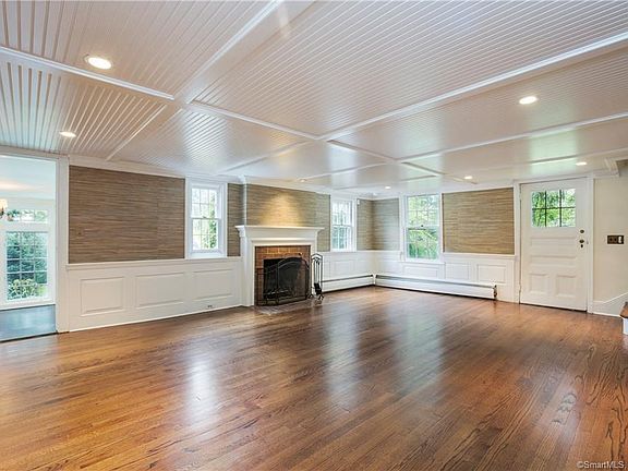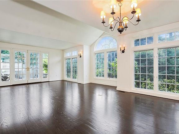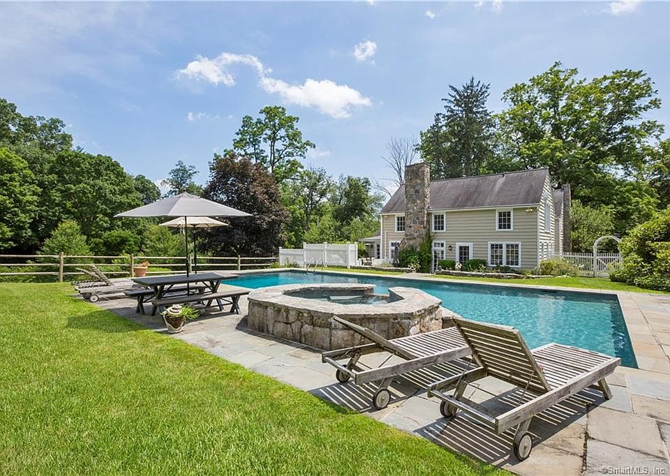 Greenwich, CT - Immaculate Gated Compound - Beautifully renovated and expanded, a cheerful turn-key Colonial with designer kitchen, marble counters, Wolf Range, stainless appliances, flows into the family room wood-burning fireplace and access to the bluestone terrace with gas grill, firepit, stainless storage. The library with custom built-ins overlooks the perennial gardens, charming sitting room with paneled ceiling and wood-burning fireplace, formal dining room with bay window, butlers pantry with refrigerator and sun-drenched great room with walls of glass overlooking beautiful lawns, french doors to patio with heated pool and spa. Separate guest house with open kitchenette, vaulted ceiling, skylights, loft, and full bath. Separate spacious studio above the three-car garage with full bath. Central Air, Generator, Storage Sheds.