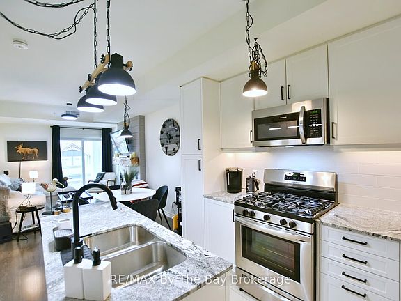 Welcome to Maintenance-Free Condo Living in the Heart of Collingwood. Discover the charm of Collingwood's sought-after Blue Fairway community with this beautifully appointed 2-bedroom, 2-bathroom condo. Perfectly situated just steps from the stunning Cranberry Golf Course, this condo offers the ultimate blend of luxury, comfort, and convenience. Step inside to an open-concept layout designed for modern living complete with beautiful upgraded lighting, barn doors and window coverings. The stylish upgraded kitchen features a large island, stainless steel appliances, accent lighting and custom cabinetry with updated hardware which is ideal for casual meals or entertaining guests. The bright living room with its cozy fireplace and dining area flows seamlessly together, creating a warm and inviting space. Both bedrooms are generously sized, and the spa-inspired bathrooms offer a touch of everyday indulgence. Extend your living outdoors on the spacious patio with serene distant views of the golf course and Blue Mountain in the distance. Practical touches include elevator access for easy grocery trips, underground parking, and a convenient storage locker. Residents enjoy exclusive access to the outdoor pool and recreation centre, making this the perfect four-season destination. Located close to restaurants, shopping, biking trails, golf, and skiing, this condo places the best of Collingwood right at your doorstep.