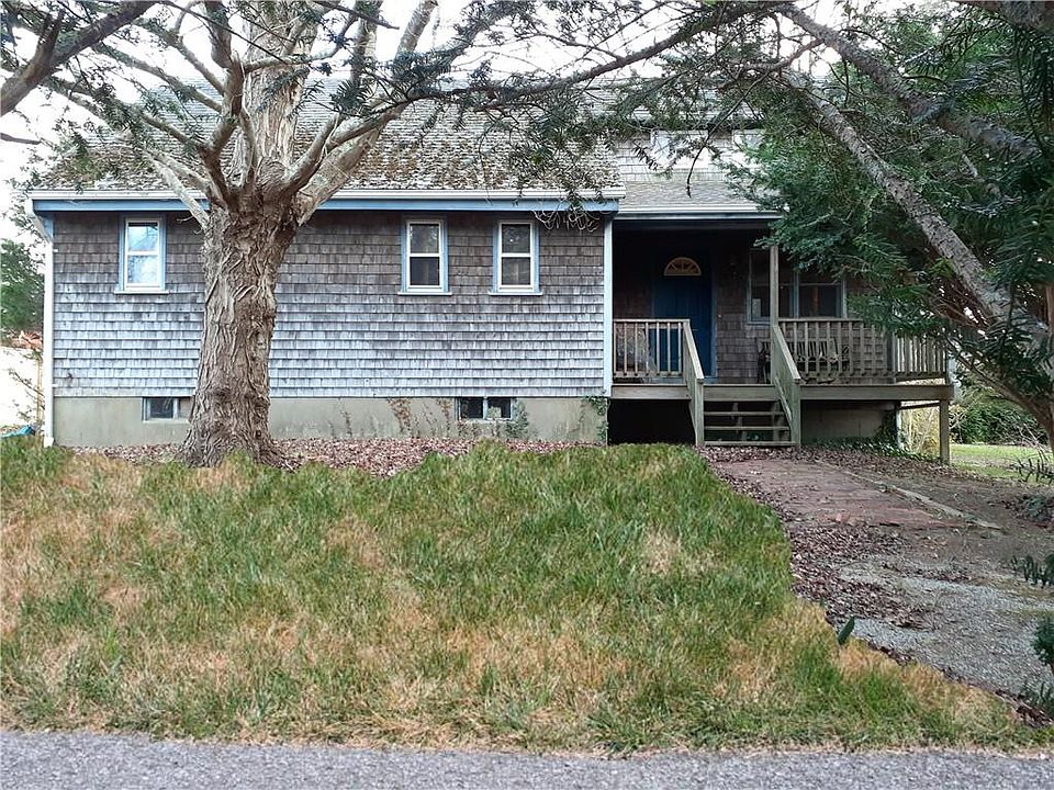 This cozy Cape style home is a great investment and opportunity, only a short walk to a private beach or a short drive to take pleasure in the amenities of the Town Center (restaurants, stores, etc.) and Harbor (Marina, Boating, Newport views). Front yard has oversized trees to provide privacy so you can enjoy the front porch. The main floor has an open floor plan with full kitchen, breakfast bar and living room and an open staircase that leads to the 2nd level. 1st floor also has a bedroom, full bathroom and laundry area. 2nd floor includes bedroom with a walkway leading to French doors that open to a spacious sunroom with a private balcony. Potential Water views at this level. House has great bones, but needs some updating. "Sold As Is".