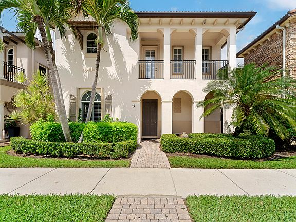 Gently used second home, decorator touches throughout. Plantation shutters, beautiful molding on walls, new washer and dryer, screened patio, covered balcony, front patio. 2 primary suites one on the main level and the other on the second level which has a separate tub and shower and double sinks. Each bedroom has its own private bath plus there is a half bath on the main level. The home is being sold completely furnished. Community is full of great amenities, resort style pool, hot tubs, tennis, pickleball, basketball, fitness center plus a tiki bar for refreshments. A true resort community. Easy access from Hood Rd, Donald Ross and resident only gate on Military Trail. Short distance to beautiful Juno and Jupiter Beaches, fine dining, The Gardens Mall, Roger Dean Stadium.