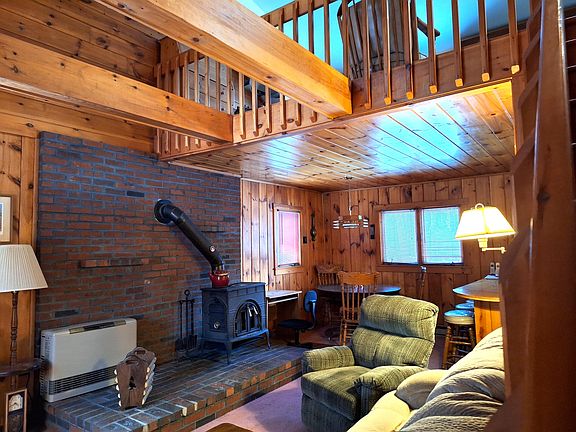 This cozy, attractive wood frame cape sits on 2.59 acres and offers that special Rangeley vacation character. The interior has an open concept living area with kitchen, dining, living room and cathedral ceiling. The stairs lead to a large bedroom and bonus room loft. The well thought out first floor has a mud room entry with laundry, a full bathroom with tub and shower, a bedroom with 2 closets, and the open concept living room, dining area and kitchen. The large pantry closet tops off the first floor living space. The second floor has room for guests and family. The most engaging features of the house are the built-in, hand-crafted wood cabinets, the sky lights and 2 gable windows. A large hearth holds a wood stove which vents to a concrete chimney. The metal roof provides easy care, and the yard is a combination of open and wooded spaces. The garage can hold sport vehicles and a car. This well-maintained property offers an open porch and deck at the front of the house. Enjoy all 4 seasons in Rangeley. Furnishings are included.