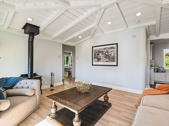 - Open-concept living room with high ceilings, open-beam accents, and a cozy wood stove