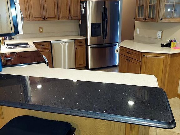- Open concept kitchen with oak cabinets, quartz countertops, tile flooring and stainless steel appliances