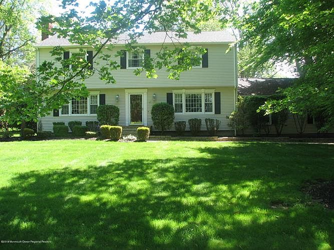 Charming colonial situated on a desirable tree lined street. Kitchen boasts white cabinetry with under cabinet lighting, granite counter tops and stainless steel appliances. Sun-filled great room off kitchen with cathedral ceilings and wall of windows. Sliders to deck with retractable awing overlooking spacious backyard. Lovely living room with gas fireplace. Spacious dining room with wainscoting, ideal for entertaining. Four large bedrooms on second level. Master has full bath and walk in closet. Hardwood floors throughout entire home. Finished basement with ample storage. Great family friendly home plus top rated Holmdel schools.