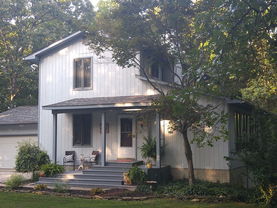 Beautiful-Quality construction of this 2700 sq ft contemporary style home located on 3 M/L acres. Lovely wooded lot with large shade trees, on a private cul-de-sac drive. 3 bd rms, 3 baths, large kitchen open to vaulted dining, and a propane/gas fire place. Attached large 2 car garage. Finished walkout basement big enough to build a fourth bd rm. Only 2 miles from Eldon city limits and just a 1/2 mile of gravel. Room to build a large shop.