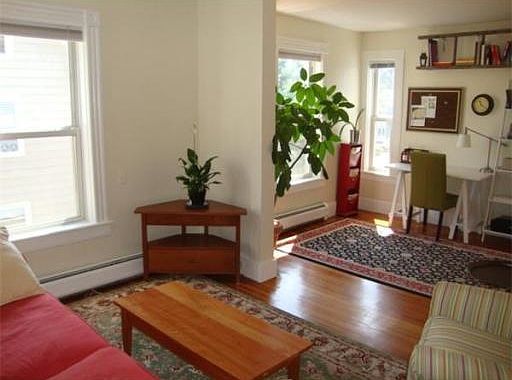 Hardwood floors, skylights and stone counters stand out in this remodeled condo (2009) just two blocks from downtown Northampton. Here's a unique design with a double living room, large bedroom, in-unit laundry room and a private covered porch with bead board ceiling. Lots of sunlight pours in from newer windows on all four sides of the house and two skylights. Hardwood floors continue throughout the unit except the fully tiled bathroom which features built in shelves and two windows. Energy Star, stainless appliances enhance the kitchen along with recessed lighting, under-counter lights and a stone back splash. Great details include original trim around the doors and windows, pocket doors on the bath and laundry, cedar lined closet in the BR, low monthly fees, extra storage in the basement, economic gas heat and off street parking. Come take a look!