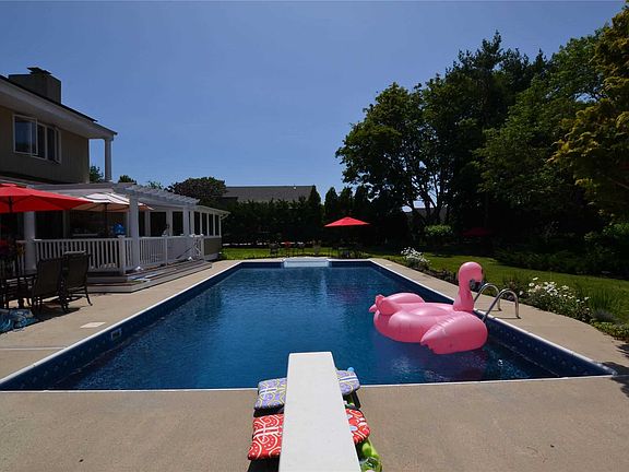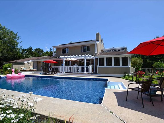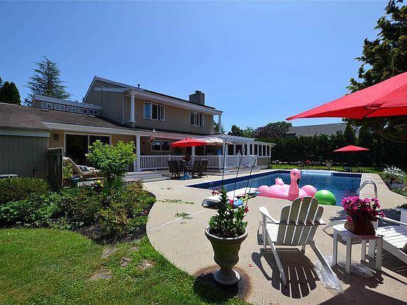 Sun-drenched and spacious South of South Country Road just down the street from the open bay on one of the most desirable lanes in Remsenburg. Extra large 2 car garage (28x28), solar panels leased, $152/month with $10/month electric bill. New enclosed sunroom on back deck overlooking pool area. Master BR on first floor with private sliders out to back deck/pool area. Open kitchen/dining area. LR with vaulted ceiling and double-sided fireplace. New pool liner.