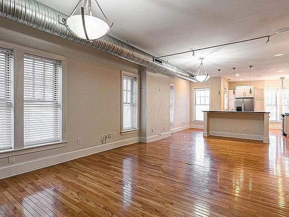Urban condo lifestyle with over 1,600 sq' of living space. Open floor plan. Kitchen with window seat, breakfast bar, access to balcony that overlooks 3rd Ave. Office space or den sits separate from the living area. Exposed brick. Natural light. Wood flooring throughout main living area. First floor laundry. Stackable washer/dryer stay. Owner's suite has plenty of closet space, en-suite bath with tub and shower. Private guest quarters separated with hall and full bath. Back deck, great space to grill and entertain also accesses garage with elevator. Visit coffee shops, restaurants and bars in minutes. Central location in the Short North.