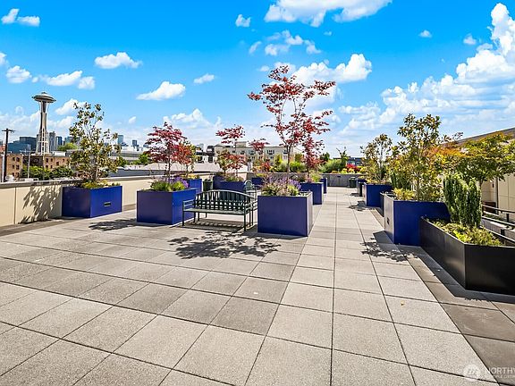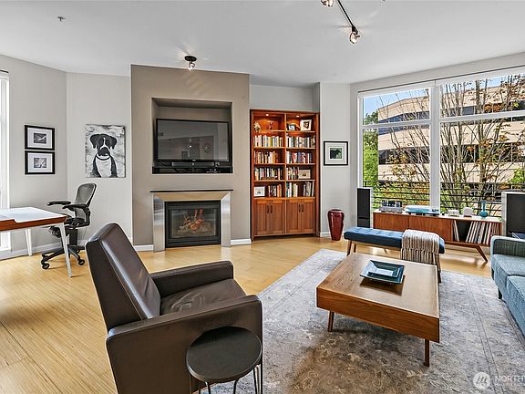 Flooded with natural light, this top floor corner unit at Tribeca is the ultimate in-city retreat. Step inside to soaring ceilings, floor-to-ceiling windows, exceptional floorplan. Prepare meals in a chef's kitchen. Relax and entertain in wide-open living and dining spaces with doors to private BBQ deck. The bedroom wing features 2/2 including primary suite w/ walk-in closet, black-out shades, private bath. You'll love the Central AC, gas fireplace, electronic blinds, bamboo hardwoods, WFH office nook, big laundry room, 2 secure parking spots. Enjoy Space Needle + city views from roof deck. Great Q.A. location: walk to local restaurants, cafes, shops, Kraken games, the waterfront, more. Easy access to SLU + downtown Seattle. No rental cap.