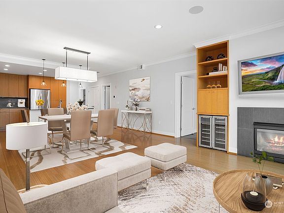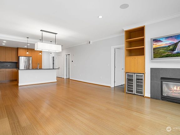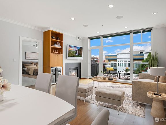 Wonderful top-floor condo in the Tribeca on lower Queen Anne. Open floor-plan with floor-to-ceiling windows for lots of natural light. Beautiful bamboo flooring warms the room. Kitchen features all SS appliances, gas stove, under-cabinet lighting, and upgraded pull-out shelves. the LARGE primary bedroom has a walk-in closet and double-sink vanity. Upgraded solid-core doors were also installed throughout the condo. A/C to keep you cool. And the deck...what a special place to be! It's spacious and made for entertaining! Unit features two secured parking spaces. Tribeca has two rooftop decks and views of the Space Needle. Just a short walk to a Kraken game, restaurants, grocery stores (2 of them), and cafes/bars. This is the one.