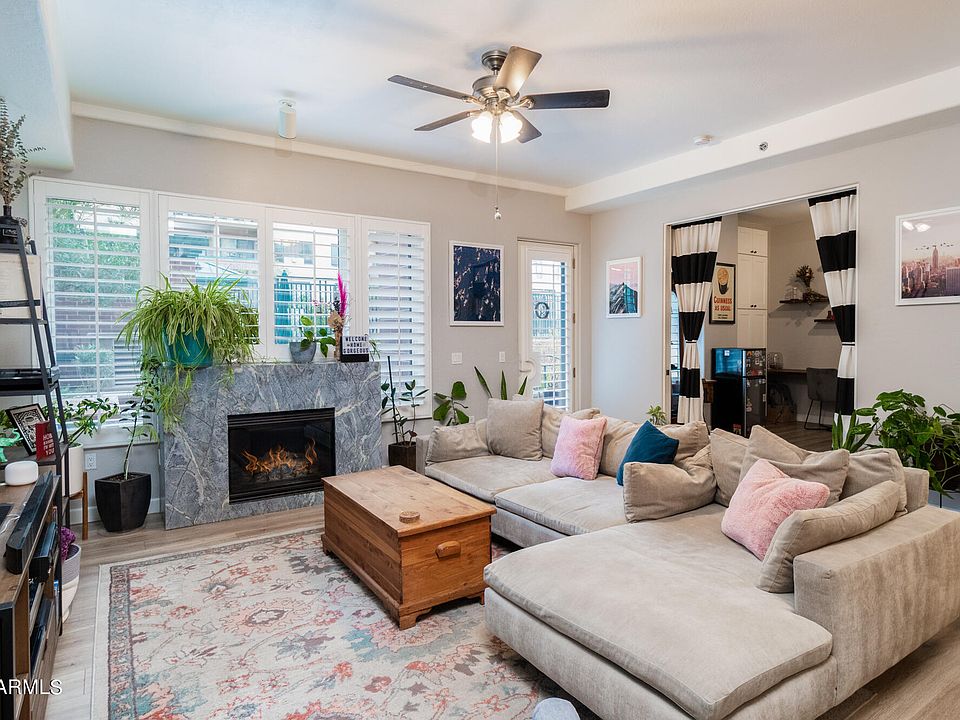 Walk into this beautiful downtown condo and be wowed by the light and bright open plan which features your great room with fireplace and dining area. Enter the upgraded kitchen with two-tone cabinets, sleek soapstone counters, SS appliances and farm sink with subway tile backsplash. You have a half bath on the first floor as well as one bedroom. The bedroom has custom built-in cabinetry, along with a desk, queen size pull down Murphy bed and elegant glass pocket doors with curtains to keep it private. There are 2 bedrooms upstairs with their own upgraded en-suite bathrooms. The primary bedroom is spacious with it's own private balcony, the bathroom features a double vanity, soaking tub w/shower and walk-in closet. The second bedroom is roomy with a full en-suite bathroom... White wood shutters cover the well insulated dual pane windows throughout the home, laminate wood floors downstairs, carpet upstairs and tile in the bathrooms. On the main level walk out onto the patio through the new retractable screen door and enjoy your favorite drink, you also have quick access to the pool from here. You have 2 underground parking spots with a Tesla EV charging station that has 3 ports and there is also a designated space in the garage for bicycles to be kept. The Light Rail stop is at Vernon and Central, it will take you to sporting events, concert venues, Tempe(ASU), Mesa, N Phoenix, S Phoenix and the Airport. If you want to take your furry canine friends out for some play Hance Park Dog Park is about a mile down the street or take a stroll through the Historic Willo district to the west of the condo. So much to do around here...Some restaurants include Oven + Vine, Little Miss BBQ-coming soon, Tru Burger, Durant's. Museums close by are the Heard(Native American), Phoenix Art and the Children's museum. Step out for a craft drink at Kings Beer or Roses by the Stairs. You will be in the perfect spot for getting to all the parades or if theatre is your jam, the Orpheum or Phoenix Theatre Company are close by. Also there are two Farmers Markets, open weekends, that are within 10 minute drive of your new home!