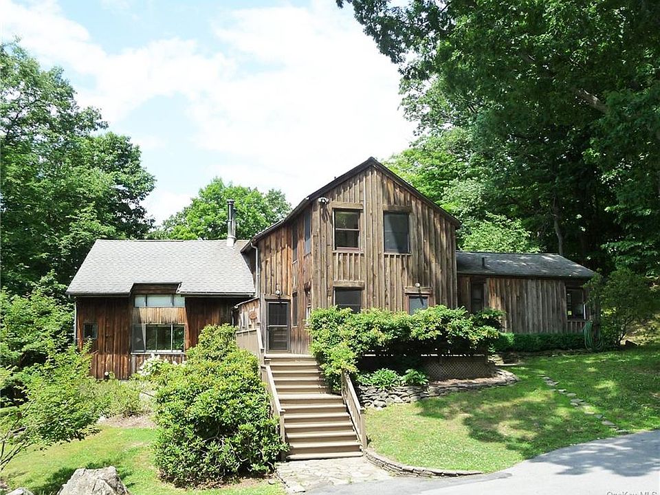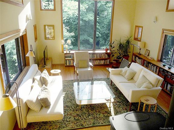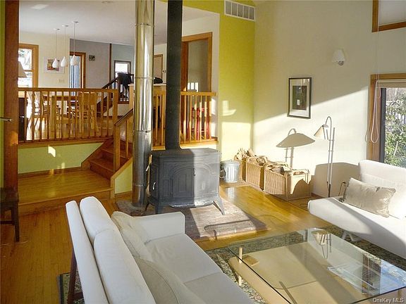 A long driveway leads you to this three bedroom, two bath architect-designed, custom built woodland contemporary on five plus acres on a beautiful country road in historic Warwick, NY. Creative use of multi-level space provides comfortable living and unusual variety and easy maintenance. The gathering room with vaulted ceiling is filled with light from windows on three sides. The kitchen and dining room are separated by a counter and the dining room opens onto the spacious but private deck which overlooks the professionally landscaped property with perennial plantings. The master bedroom and bath are conveniently located just a couple up steps up and also have deck access. The well-lit stairs lead to the upper level where two additional bedrooms each have access to the jack and jill bath. The laundry is adjacent to the kitchen and there is a large garden shed for storage of tools and other items.